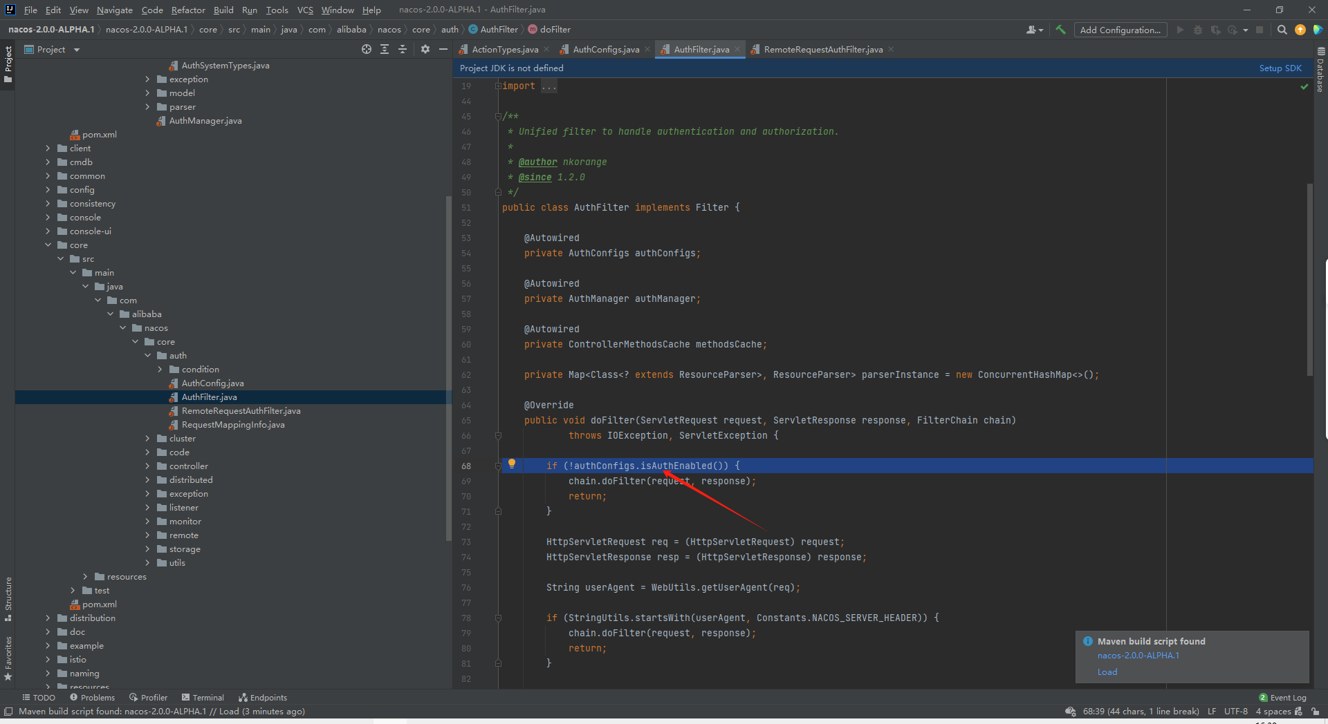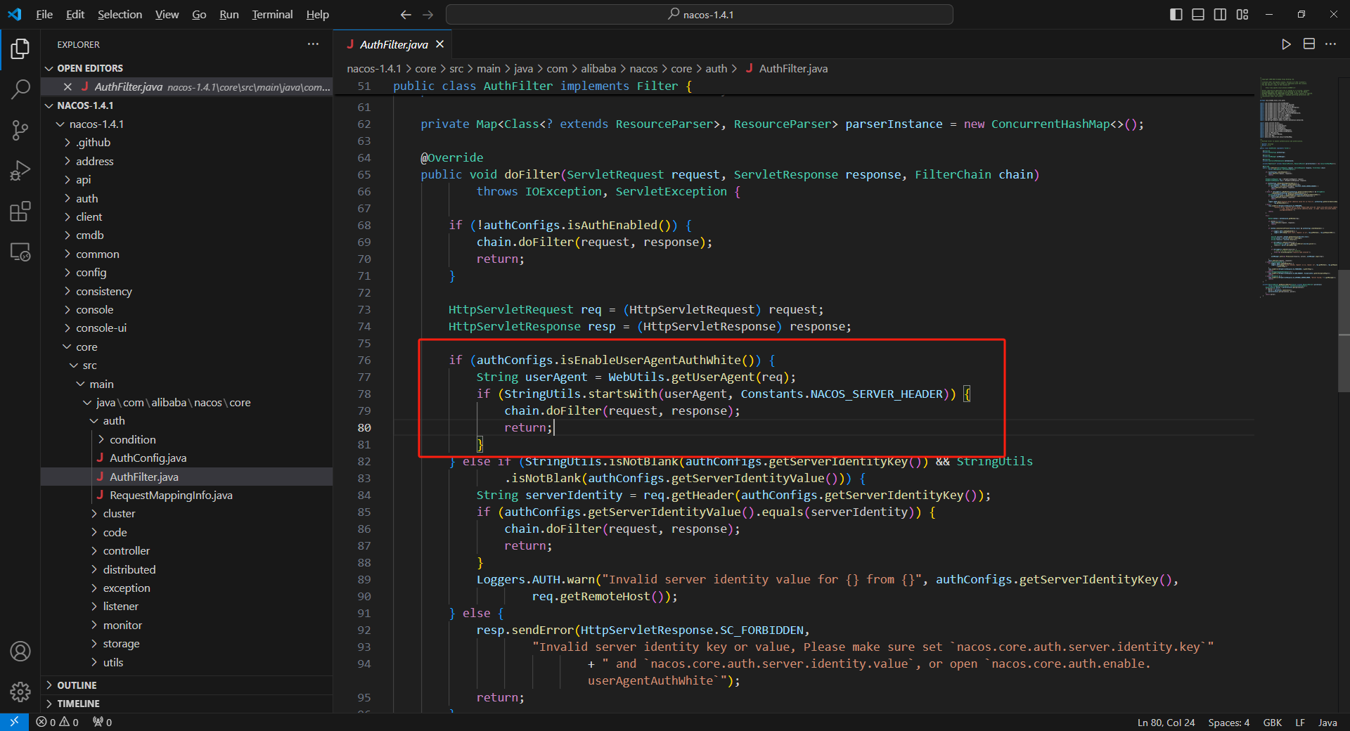 相关代码文件是core/src/main/java/com/alibaba/nacos/core/auth/AuthFilter.java
