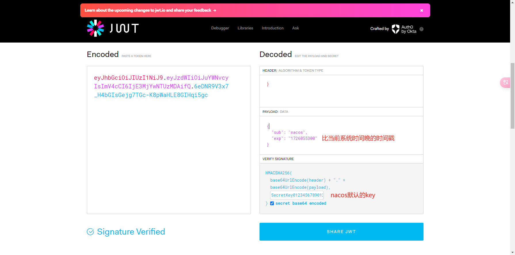 将默认key拿到在线的jwt生成网站:https://jwt.io/