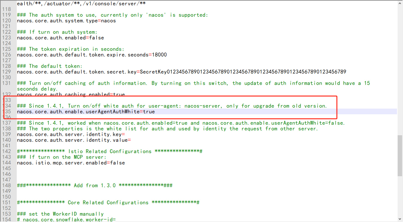 配置文件中nacos.core.auth.enable.userAgentAuthWhite = true,就会获取请求头中UserAgent的值,然后判断是否是以字符串Nacos-Server为开头,若是则直接跳过鉴权。
