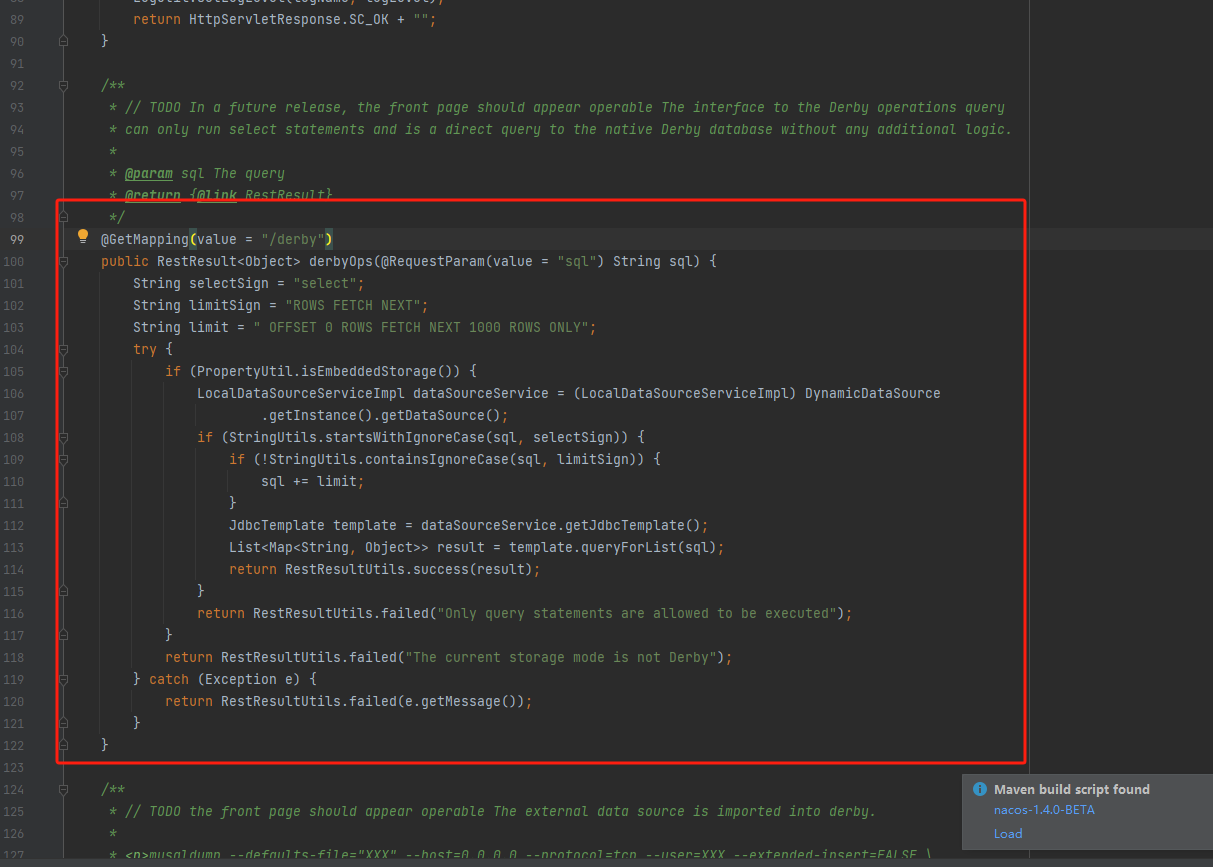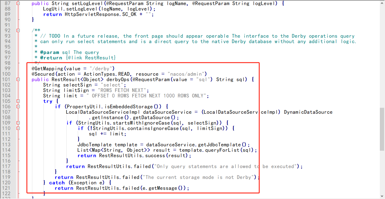 漏洞代码在config\src\main\java\com\alibaba\nacos\config\server\controller\ConfigOpsController.java#derbyOps